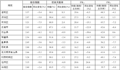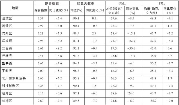 备注:1、涪城区以绵阳市气象局、三水厂、西科大附属小学3个站点浓度的平均值进行计算;