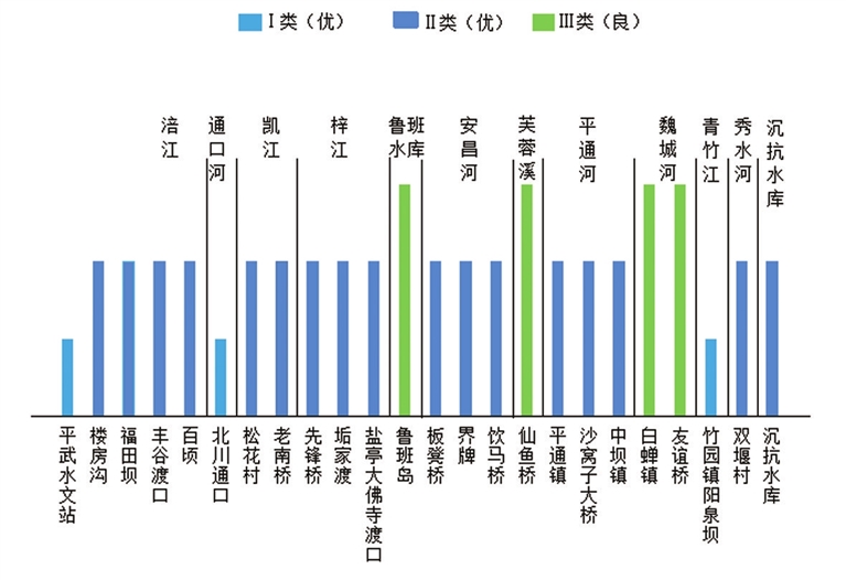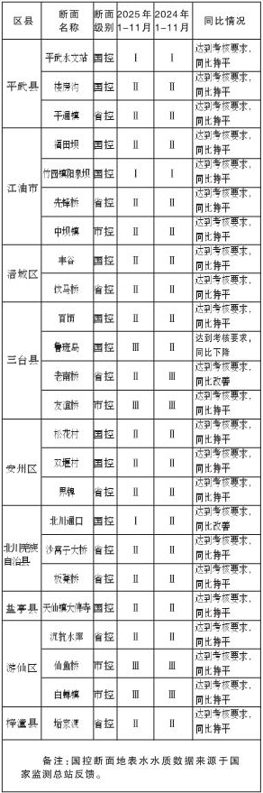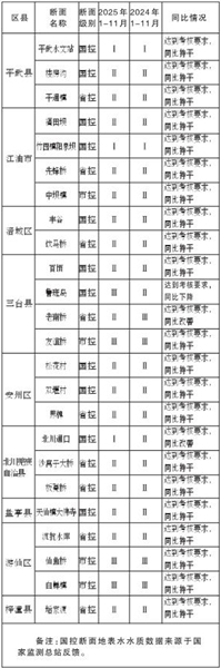 2025年1-11月,全市24个断面水质优良率(Ⅰ-III类)为100%。11个国控断面中,鲁班岛水质为良,其余均为优;9个省控断面均为优;4个市控断面中,中坝镇水质为优,其余均为良。