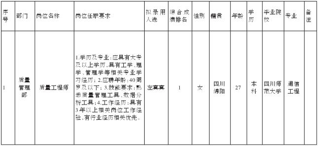 根据四川九华光子通信技术有限公司发布的招聘公告及招聘相关规定,经测试、考察、体检等程序,拟录用左真真同志到四川九华光子通信技术有限公司工作,现予以公示,具体情况如下: