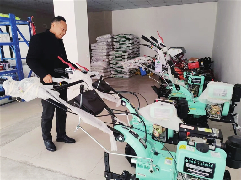 12月20日清晨,三台县富顺镇的田野山坡还笼罩着一层薄雾,该镇供销社负责人马宁已经打开大门,开始清点农机。干净整洁的大厅里,10余台崭新的旋耕机锃亮耀眼。