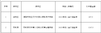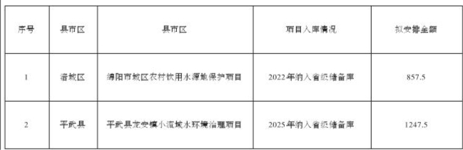 四川省财政厅、四川省生态环境厅以川财资环〔2025〕65号下达我市2025年省级生态环境质量激励资金2105万元。根据“资金跟着项目走”的要求,我局选取央省储备库符合资金分配条件的项目,会同绵阳市财政局拟定了资金分配方案,现予以公示。