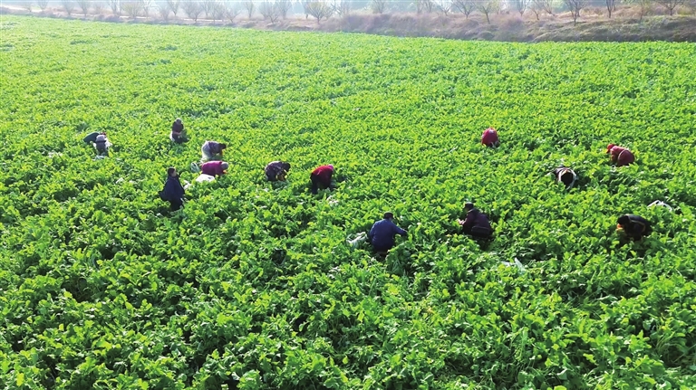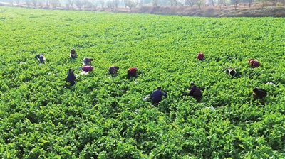 ①三台立新镇万宏源家庭农场油菜地里,农户正在采摘油菜薹。 记者 刘凤君 摄