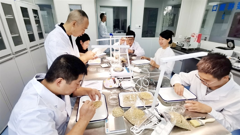 工作人员对粮产品进行仔细检测。 记者 唐甜 摄