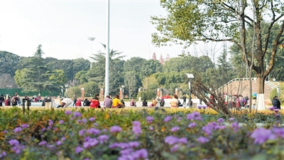 市民在公园散步休闲。 记者 兰建春 摄