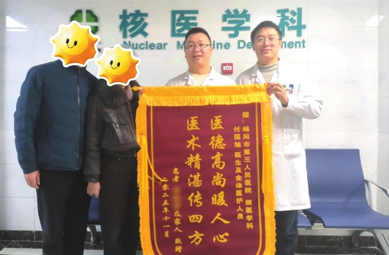 近日,绵阳市第三人民医院核医学科付国旭和廖太平医生收到了一份特别的礼物——甲状腺乳头状癌患者赵女士送来的一面写有“医德高尚暖人心,医术精湛传四方”的锦旗。