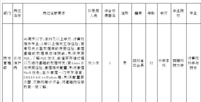 绵阳市绵州通科技有限责任公司关于招聘系统维护岗位拟录用人员的公示