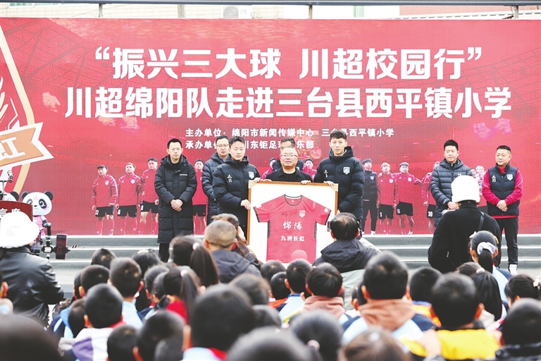 本报讯(记者 李锦辉 胥江)绿茵逐梦,激情飞扬。12月26日,“振兴三大球 川超校园行”系列活动走进三台县西平镇小学,川超绵阳九洲长虹队球员与孩子们零距离互动,以一场热闹非凡的足球主题活动,播撒运动火种,助力校园足球发展。本次活动由绵阳市新闻传媒中心、三台县西平镇小学联合主办。