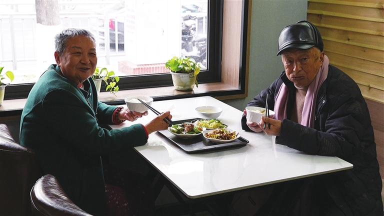 两位老人在幸福餐厅用餐。 记者 彭雪 摄