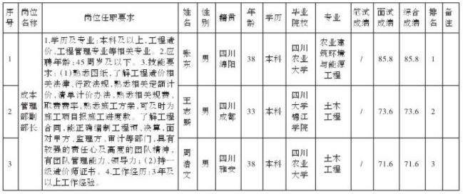 四川九洲建筑工程有限责任公司关于招聘成本管理部副部长测试成绩的公示