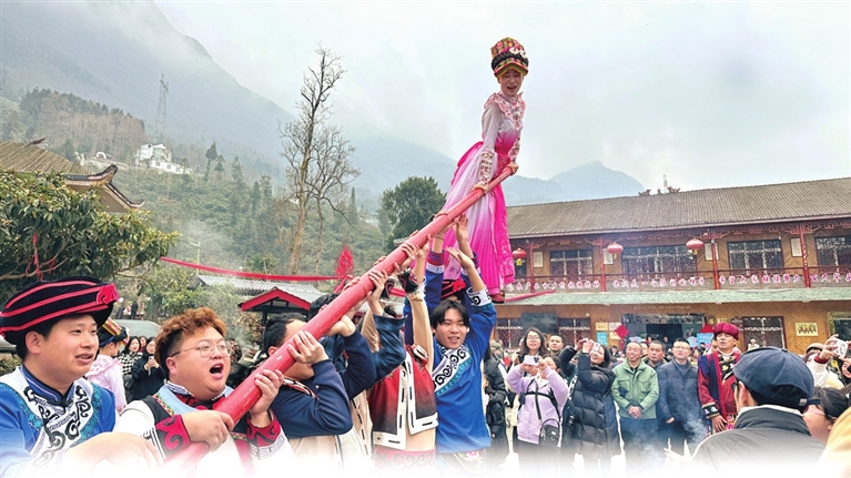1月1日,北川石椅羌寨举办“徒步登山+非遗推杆竞技”迎新活动,千余名羌族群众与各地游客以运动健身、体验非遗的方式,共同开启健康向上的新年第一天。 记者 唐舒琪 摄