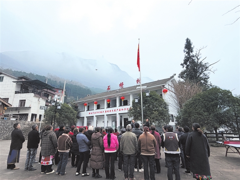 北川石椅村升国旗迎元旦。 记者 唐云峰 摄