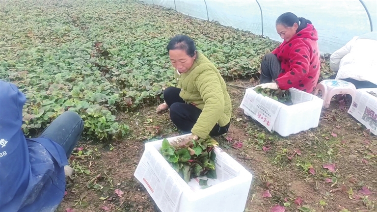 村民在温棚里收割折耳根嫩苗。