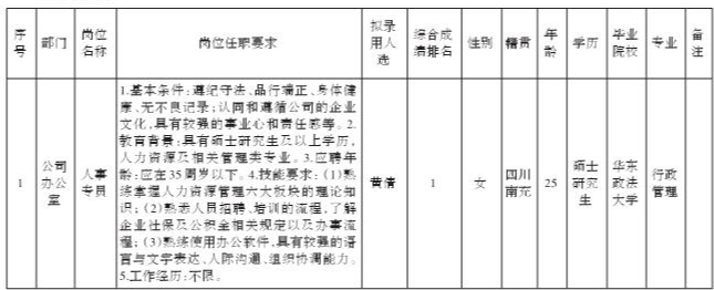 根据四川湖山电器股份有限公司发布的招聘公告及招聘相关规定,经测试、考察、体检等程序,拟录用黄倩同志到四川湖山电器股份有限公司工作,现予以公示,具体情况如下: