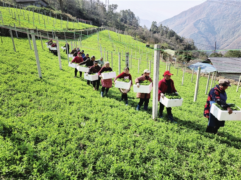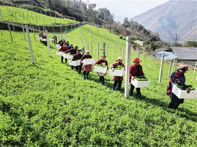 北川坝底乡金山村村民采收豌豆尖。 视觉绵阳资料图片