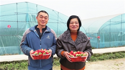 何跃斌、唐琪芳夫妇展示采摘的草莓。