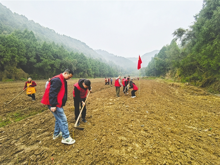 日前,盐亭县文通镇高观村的田野里一派火热景象,连片的土地上,锄头与铁锹上下挥动,村民们三五成群,弯腰栽苗、搬运桑枝,一株株桑苗被稳稳栽进土里。