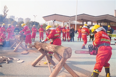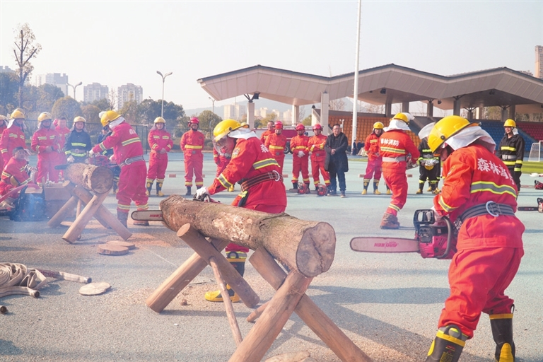 比武现场,参赛队员严格按照机具实务操作技术要领,完整规范穿戴防护服,实地操作油锯、背负式风力灭火机的启动、切割、关闭,协同配合使用便携式消防水泵的启动和串联使用。队员们相互之间配合默契,动作快捷而有力,充分展现了较高的专业素养和团队协作精神。