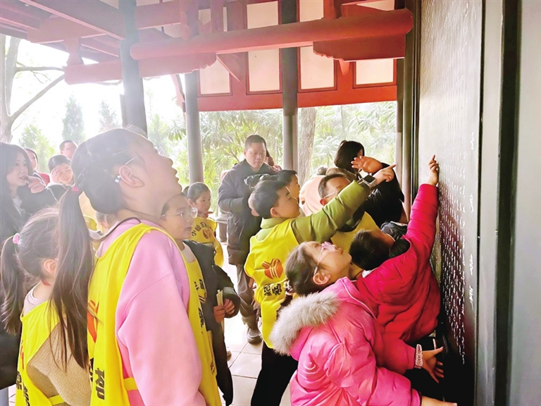 “小心自可襄诸葛,大度犹能恕二杨。”活动现场,导读老师带领小读者们初识“蜀汉四相”之一的贤相蒋琬,讲解“蒋恭侯”谥号的由来,将蒋琬得诸葛亮举荐和宽以待人等历史故事娓娓道来,蒋琬沉稳大度的君子风范让小读者们连连赞叹。在子云亭,小读者们了解了西汉大儒扬雄治学的故事,齐声诵读唐代文学家刘禹锡创作的《陋室铭》,在穿越千年的名句中,感悟古人的精神风骨与绵州文脉底蕴。