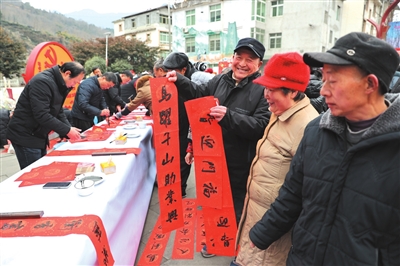 市文联的书画家挥毫泼墨,满载祝福的春联送到群众手中。 记者 陈冬冬 摄