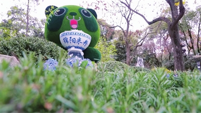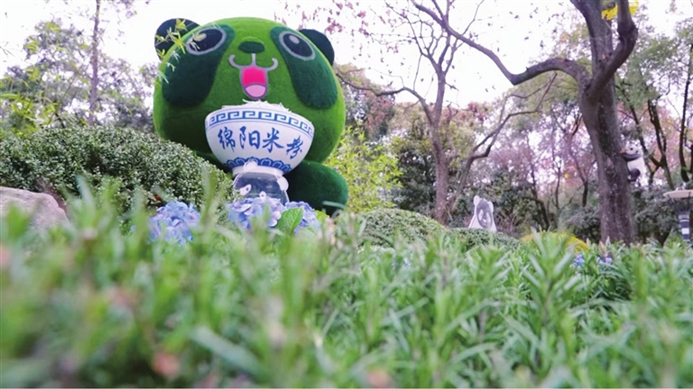 “今天逛人民公园,看见这个熊猫造型景观,真的好看。它抱着一碗米粉,简直就是咱们绵阳的标志嘛。周围的绣球花配着绿植,颜色又鲜又亮,拍照特别出片。”游客杨智涵一边拍照一边说。