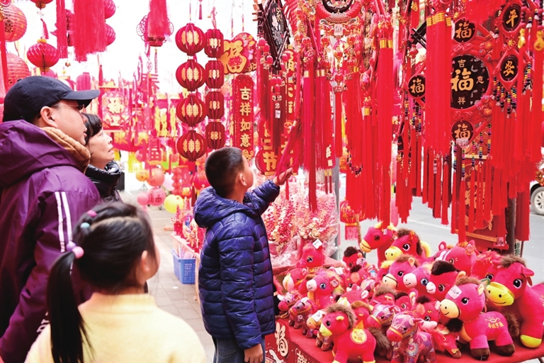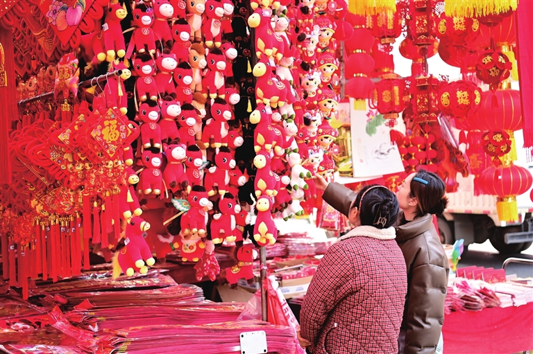 1月17日,恰逢周末,记者在绵阳城区小商品批发市场和大型商超看到,随着农历马年的脚步越来越近,寓意吉祥的福字、火红的灯笼、喜庆的春联,还有造型各异的“马元素”摆件等各类新年饰品琳琅满目,喜气又好看,吸引了不少市民选购。