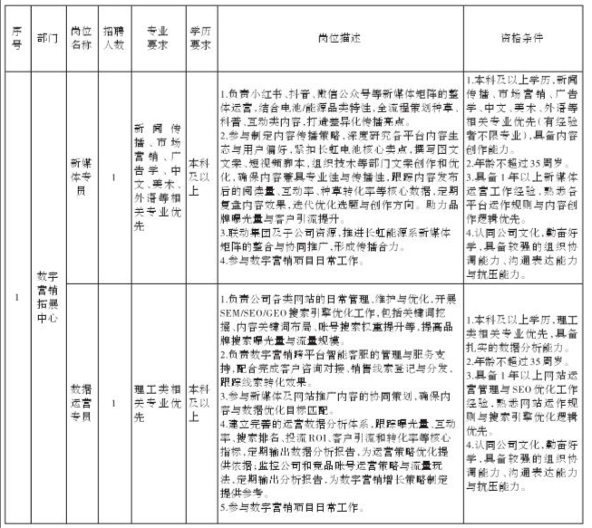 因经营业务需要,现公开招聘新媒体专员、数据运营专员各1名,具体职责及要求如下: