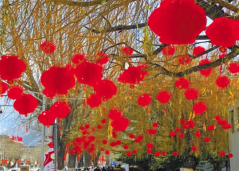 图为在拉萨宗角禄康公园外,红灯笼高挂树梢,喜迎两会。本报记者 洛桑 摄