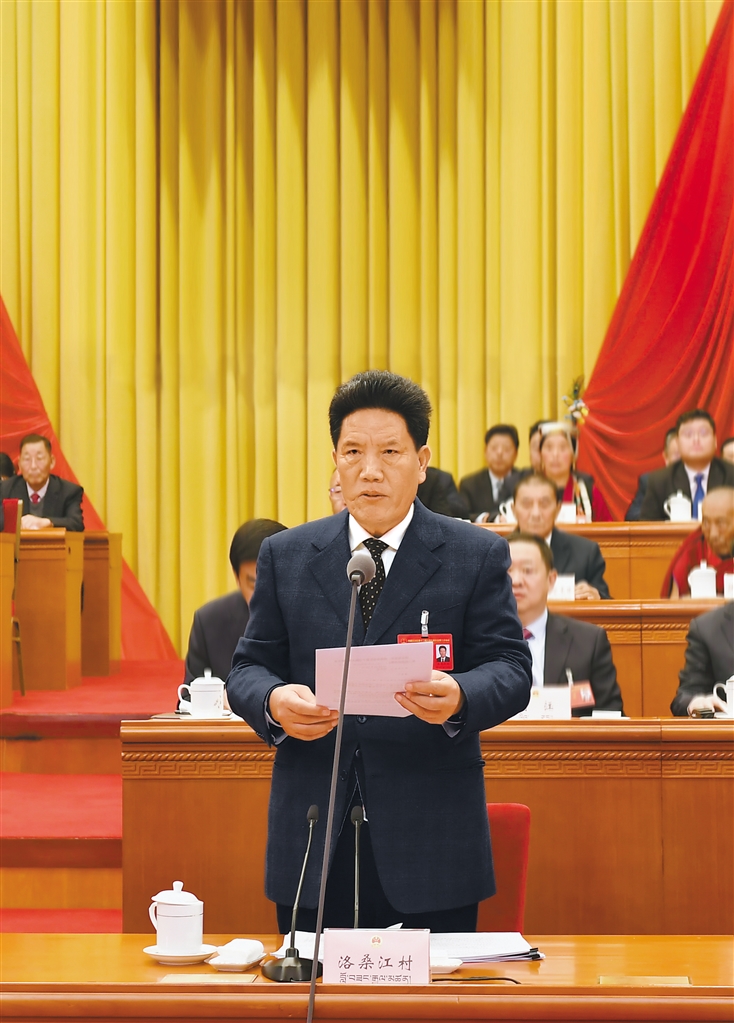 上午9时30分许,洛桑江村宣布:西藏自治区第十二届人民代表大会第二次会议开幕。会场全体起立,高唱国歌。