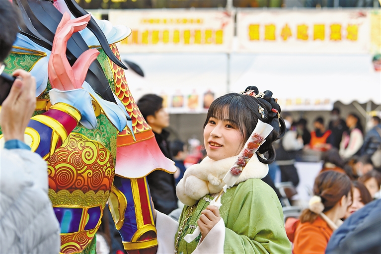 这是1月5日,在日本名古屋市第18届“名古屋中国春节祭”上,一位身着传统服饰的游客拍照留念。
