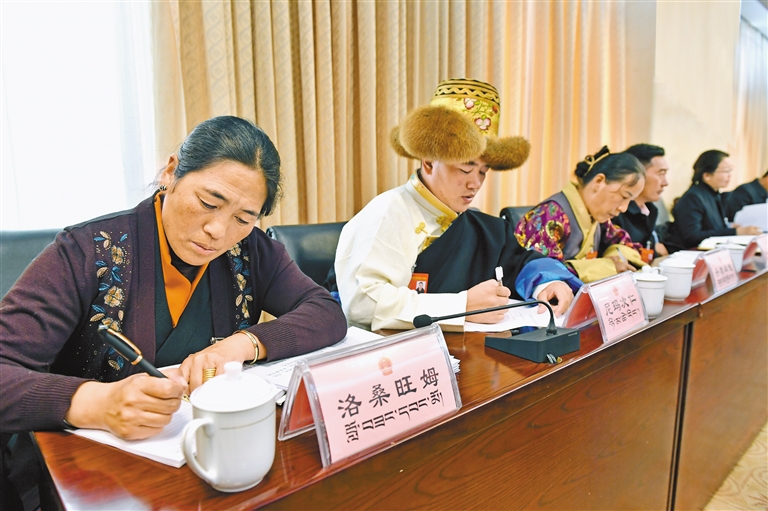 图为山南市代表团代表在认真审议政府工作报告。本报记者 次仁平措 摄