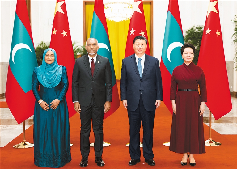 1月10日下午,国家主席习近平在北京人民大会堂同来华进行国事访问的马尔代夫总统穆伊兹举行会谈。这是会谈前,习近平和夫人彭丽媛在人民大会堂北大厅为穆伊兹和夫人萨吉达举行欢迎仪式。新华社记者 黄敬文 摄