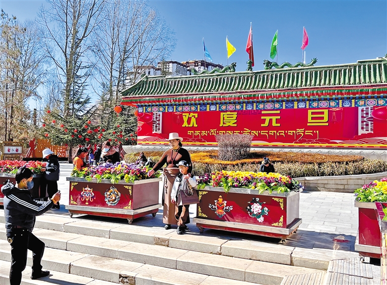 2024年元旦来临之际,拉萨市宗角禄康公园挂上了鲜艳的红灯笼,营造出祥和欢乐的节日氛围。