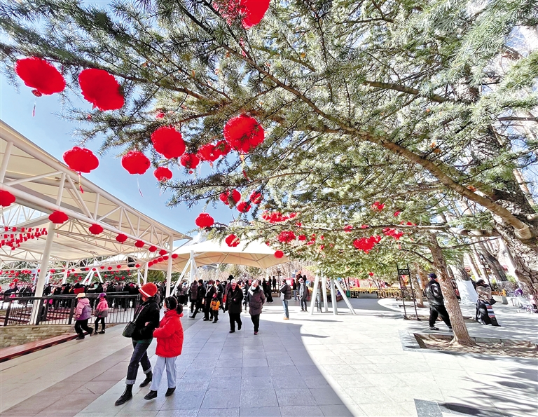 右图:宗角禄康公园内,红灯笼高挂树梢,呈现出欢乐热闹的节日气氛。 本报记者 旦增兰泽 摄