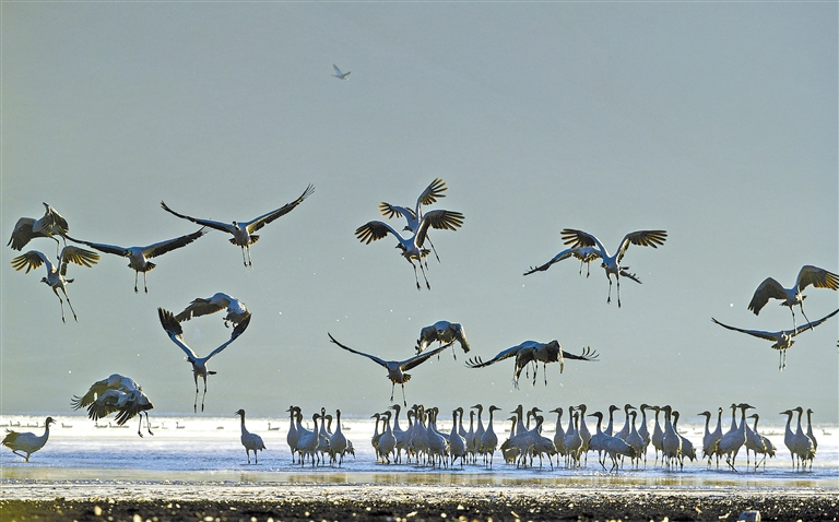 图为林周县境内的黑颈鹤在冬日朝阳下嬉戏。 本报记者 潘多 摄