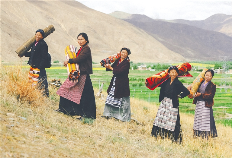 图为藏毯厂女工展示自己编织的藏毯。本报记者 刘枫 摄