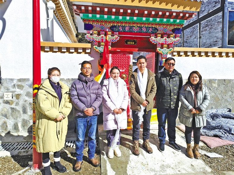近日,扎囊县组织辖区第一批搬迁群众正式入住位于隆子县扎日乡亚绕3号安置点的新家,并为搬迁群众发放3万元补助奖励资金,积极同安置点驻村工作队、村“两委”班子成员开展后续政策衔接等工作。图为搬迁群众达瓦次仁一家与工作人员在新家门前合影留念。本报记者 武沛涛 摄