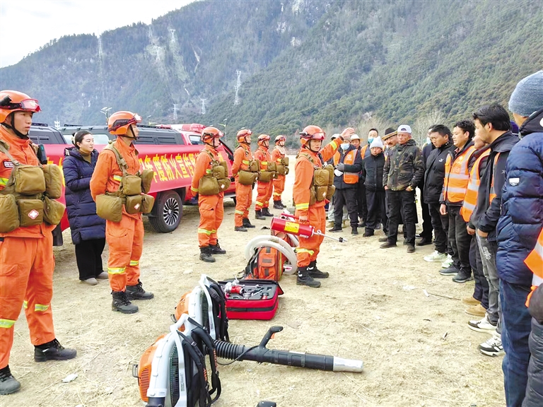 下图:消防队员对参训人员讲解扑救森林火灾注意事项等方面内容。