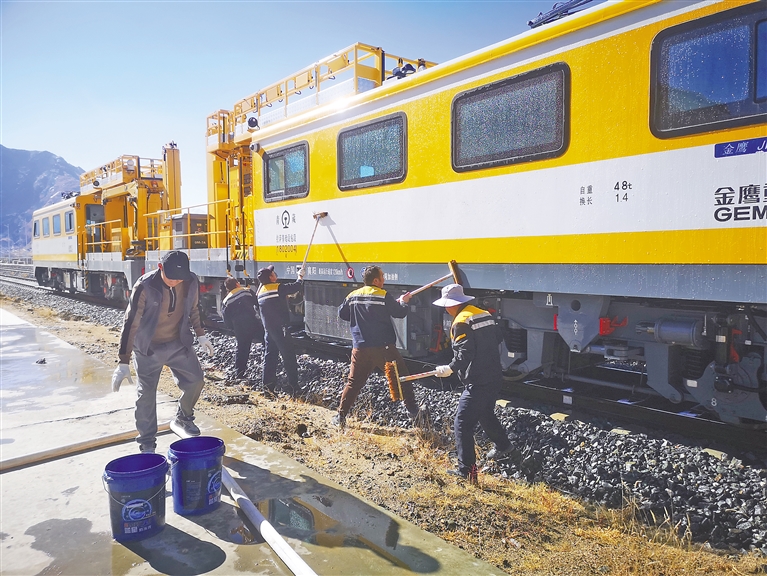 图为拉萨基础设施段工作人员在清洁轨道车。