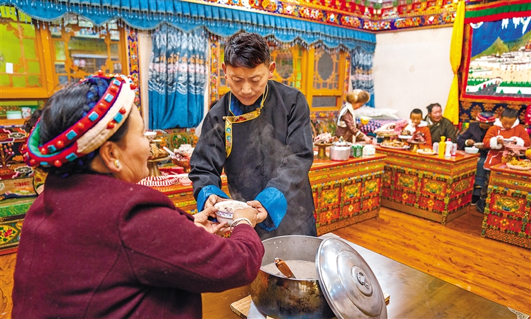 在日喀则市桑珠孜区洛玛彩林社区,59岁的巴桑普尺掌勺家里的“古突”宴。和面、揉面、煮面,火炉上一锅牦牛肉汤热气腾腾。巴桑普尺高兴地说:“今年是第一次在新房里过年,很开心。”