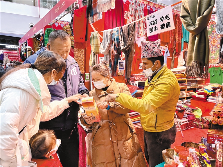 图为拉萨市民在展销会上选购年货。本报记者 旦增兰泽 摄 日前,在自治区和拉萨市商务部门的推动下,为期11天的拉萨藏历新年进口年货节展销会在嘎吉林广场拉开帷幕。此次展销会吸引了来自尼泊尔和不丹等国参展商前来参展。印度家具、尼泊尔工艺品、斯里兰卡红茶、不丹布料等独具特色的年货琳琅满目,让消费者目不暇接,为古城拉萨增添了浓浓的年味。