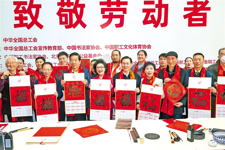 1月16日,由全国总工会指导,全国总工会宣传教育部、中国书法家协会主办的万福迎春——2024年“送万福、进万家”书法公益活动在北京举办首场示范活动——“致敬劳动者”专场,出席活动的多位书法家挥毫泼墨,为劳模工匠代表和一线职工书写春联和福字,表达新年问候与祝福。“送万福、进万家”书法公益活动已连续举办10年,成为深受群众喜爱的职工文化品牌。