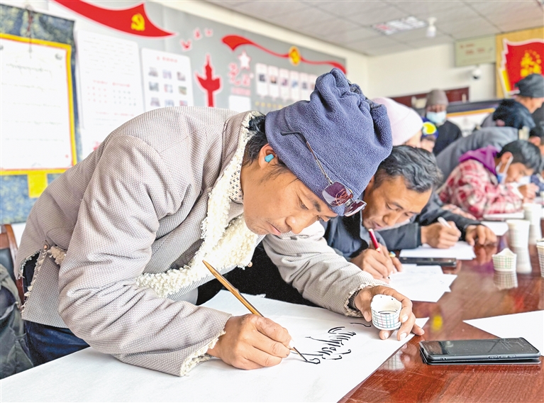 图为琐作乡群众在创作藏文书法作品。本报记者 丹增群培 本报通讯员 多吉次旺 摄