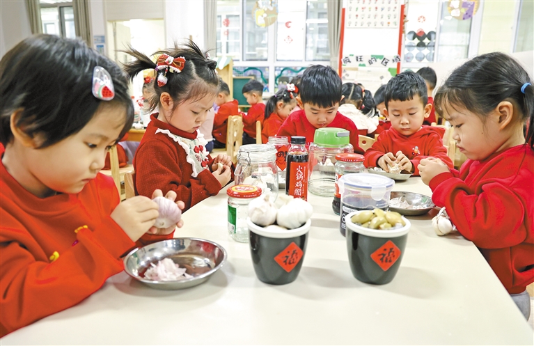 1月17日,山东省滨州市滨城区清怡幼教集团第十一实验幼儿园的孩子们在学习制作腊八蒜。 新华社发(初宝瑞 摄)