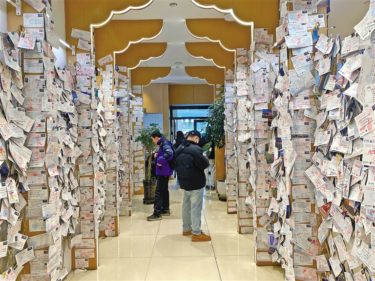 图为游客在参观独具特色的“天上西藏”主题邮局明信片墙。