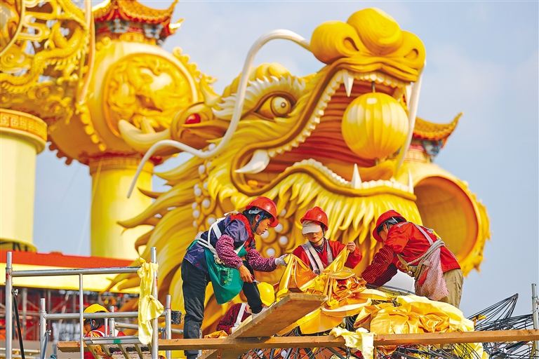 图为1月18日,在四川省自贡市的中华彩灯大世界内,工人在制作彩灯。