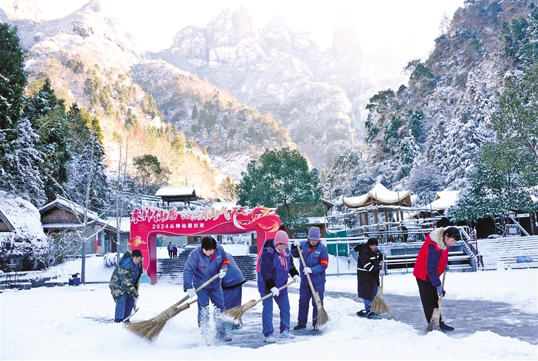 图为1月23日,浙江省台州市仙居县神仙居景区工作人员在清除旅游通道冰雪。 新华社发(王华斌 摄)