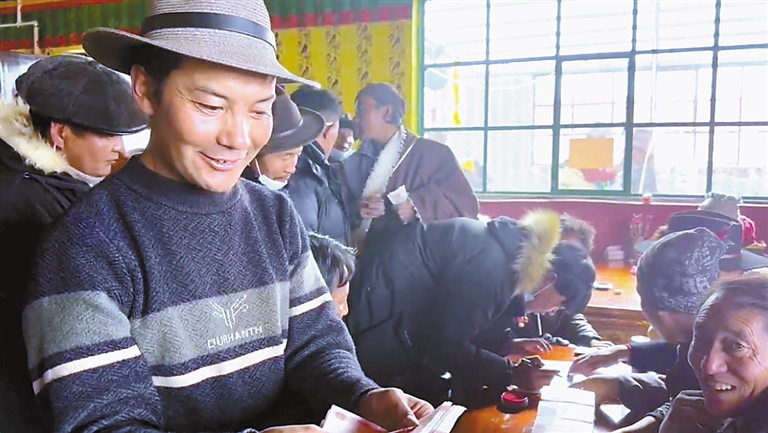 图为根琼村群众在领取分红。(图片由根琼村第十二批驻村工作队提供)
