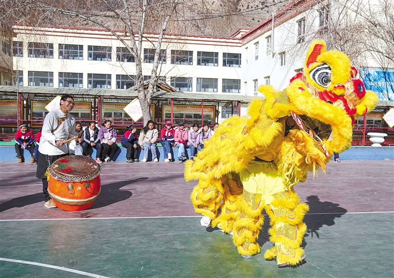图为在昌都市洛隆县硕督镇小学,邓巴阿尼(左)和弟子们在表演狮子舞(1月19日摄)。新华社记者 孙非 摄