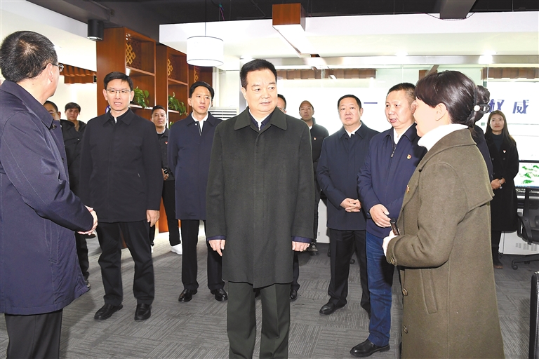 1月24日,自治区党委书记王君正检查指导安全生产工作、节日市场供应等,看望慰问一线工作人员。这是王君正来到自治区气象局,听取气象监测、预报预警、气象服务等情况汇报,看望慰问工作人员。 本报记者 李洲 摄