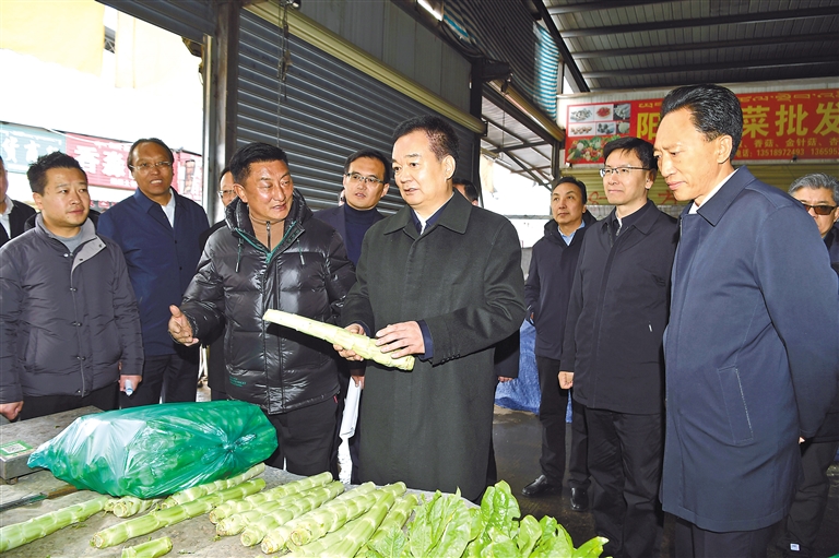 1月24日,自治区党委书记王君正检查指导安全生产工作、节日市场供应等,看望慰问一线工作人员。这是王君正在东嘎农贸市场,检查节日市场供应、食品安全工作,仔细询问米面油、肉奶蛋、蔬菜、水果等生活必需品的市场供应、货源组织、质量价格。本报记者 李洲 摄